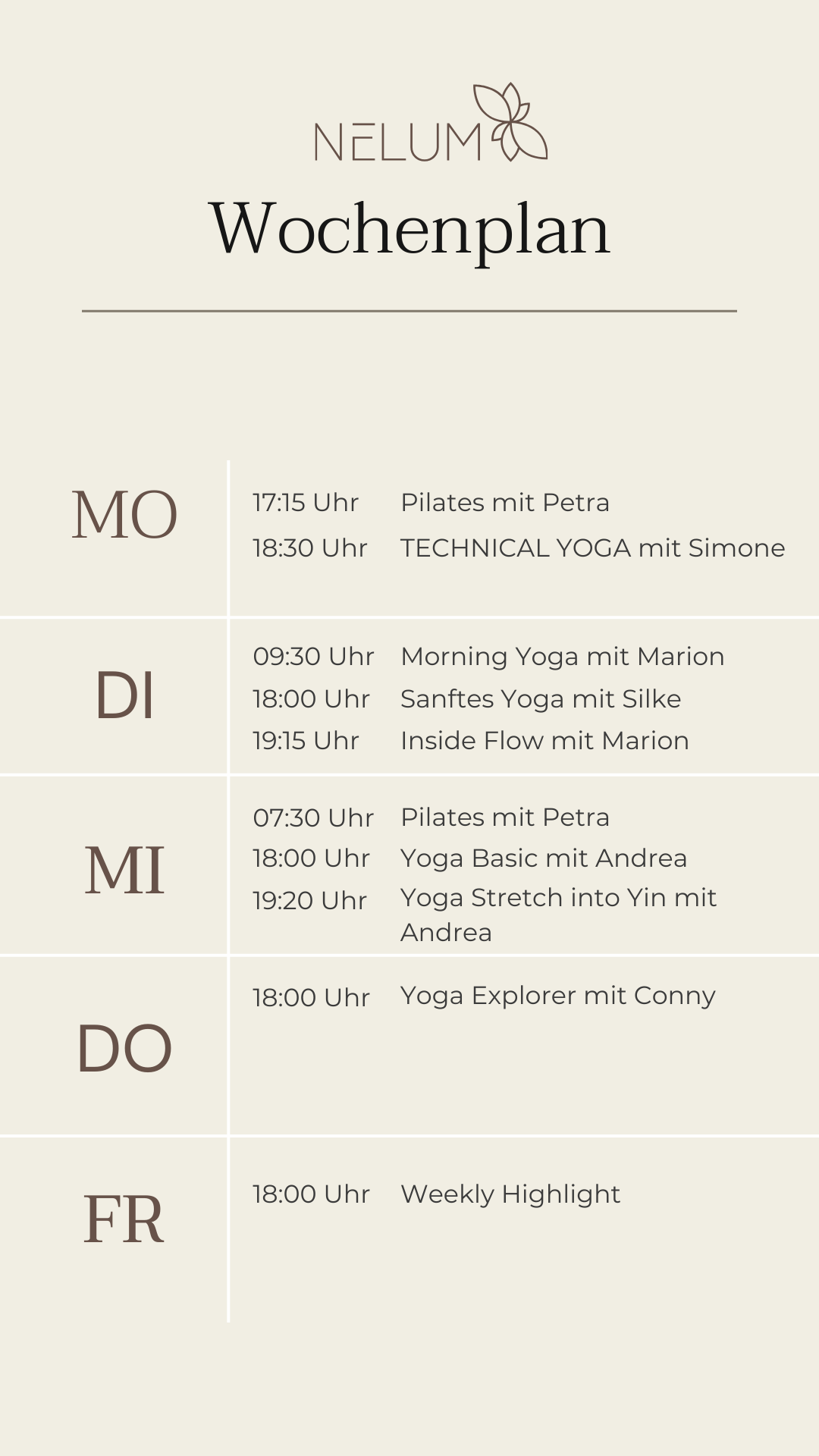Nelum Plus ergänzt unser reguläres Kursprogramm durch exklusive Zusatzstunden, die dir noch mehr Möglichkeiten bieten, deine Yoga-Reise individuell zu gestalten. Diese Einheiten sind flexibel nutzbar – egal ob mit Zehnerkarte, Wellpass oder All-In- Yoga-Pass. So kannst du unser Angebot ganz nach deinen Bedürfnissen erweitern und die Vielfalt von Nelum Yoga in vollen Zügen genießen.Du hast Fragen